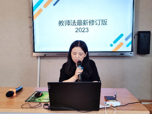 首先,由王园长带领教师们学习2023年最新版《中华人民共和国教师法》。更新了全体教师对法律的认识,更是清楚的了解到教师的法律地位。同时重点对 第一章总则、第二章权利与义务、第三章考核、第四章法律与责任进行了详细的解读。王园长通过一个个实例让教师们明白了作为一名教育前线的教师所应尽的责任和义务。