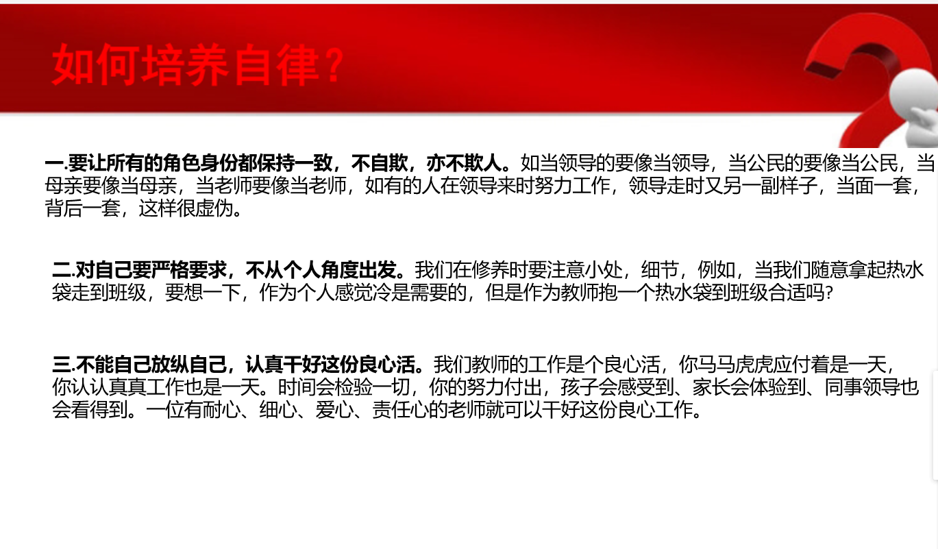 培训内容一:“做一名自律的幼儿教师”,王春红园长从对自律的理解、自律的本质、自律在我们生活中的体现、我们改如何自律等方面进行了全面的解说,如何做到自律?从一下的自律三部曲: