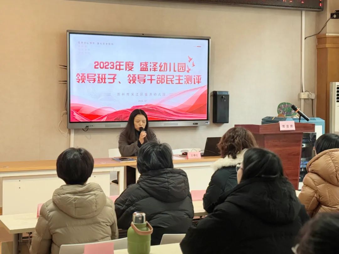 为不断提升幼儿园的办园水平,2023年12月26日,吴江区教育局责任督学吴金英、潘美娟两位园长莅临盛泽幼儿园,进行十二月专项督导活动。本次督导通过听取汇报、民主测评、查阅档案、实地考察、个别访谈、反馈提升等方式,全面了解幼儿园各项工作的开展情况。
