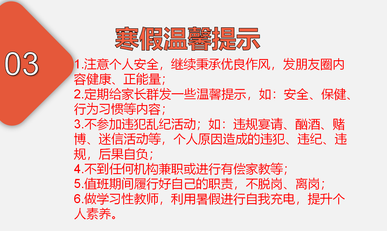 寒假提醒铭于心,永担使命塑师风。2024年寒假将至,为深入贯彻习近平新时代中国特色社会主义思想和党的二十大精神,加强我园师德师风建设,规范教师从教行为,充分发挥教师师德表率作用,王园长特向全体教职员工发出温馨提示:
