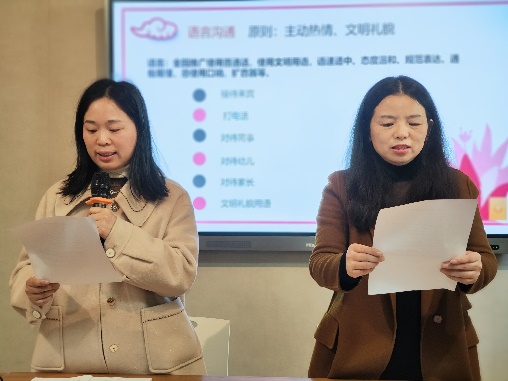 紧接着,由德育主任钱凤梅老师主持。钱老师围绕《盛泽幼儿园教师礼仪行为规范》为主题,从教师的精神面貌、职业修养、仪容仪表、行为举止、语言沟通等方面进行了详细地讲解,对教师的站姿、走姿、蹲姿、坐姿和手势等动作逐一进行了规范。以理论的方式,让教师们明白一言一行如何至善至美,如何以一种美的姿态待人接物,从而以美育美。阐述了作为一名幼教工作者我们肩负的责任感和使命感,让老师们更加深刻的了解、懂得作为教师应严守教师职业道德规范,更加明确师德不是简单的说教,而是一种精神体现,一种深厚的知识内涵和文化品位的体现,更是每位教师的自我修养、自我完善树立良好的师德形象。教师不仅仅是教授知识的源泉,而且是传承文明的导师,教书育人的园丁,以身作则的楷模。师者,传道授惑解也。不仅表现在课堂上,而且表现在生活中,表现在无数细节中。