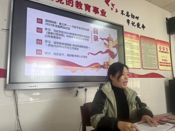 随后,陶晓红通知围绕“习近平在2024年春季学期中央党校中青年干部培训班开班之际重要指示”和“逐梦教育强国路 奋进发展新征程——两会内外热议政府工作报告”两部分内容展开了生动详细的党课讲解,并对“做教书育人大先生”提出了的几点要求:第一,要坚定理想信念,做胸怀“国之大者”的典范;第二,要坚持立德树人,做修德立身的示范;第三,要坚守教育初心,做教书育人的模范;要潜心研究真学问,做学术创新的洪范。她强调,要积极响应党的号召、听从党的指挥,认真学习领悟习近平总书记重要讲话的重大意义、丰富内涵和实践要求,更加自觉地坚定信心、鼓足干劲、勇挑大梁,以实际行动和实在成果在各自的教育岗位上立德树人,为孩子的成长共同努力。