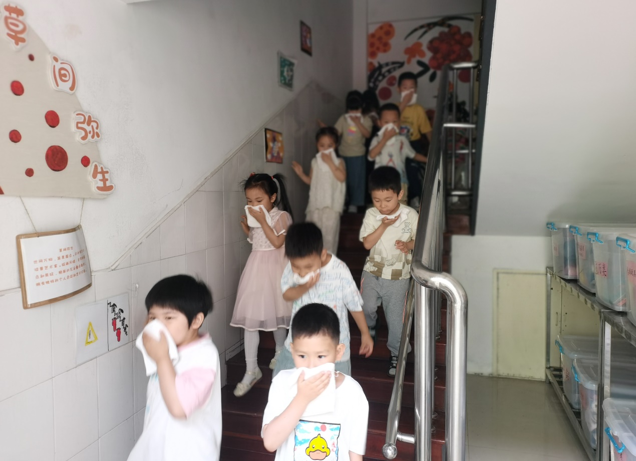 演练过程中,老师们本着"安全第一"的原则,有序地组织幼儿快速、科学疏散。全体幼儿捂住口鼻、低头弯腰,不惊慌、听指挥、动作敏捷、无推挤、无冲撞地安全逃生。