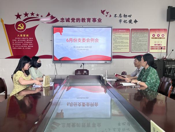 2024年6月18日,盛泽幼儿园党支部在辰星楼会议室召开6月份支委会例会。此次会议共有三项议程:一是讨论优秀党员教师及家访相关事宜;二是确定本月党课主题及内容;三是讨论本季度党费的缴纳。