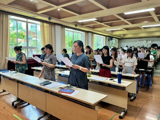 接着,德育主任钱老师带领全体教师重温《盛泽幼儿园师德考核细则》强调,为人师表的“仪态妆容”、“文明用语”以及“廉洁从教”,提醒全体教职工不接受家长宴请和礼物等。随后有王园长和钱老师一起带领大家宣读“盛泽幼儿园教师职业道德承诺书”。 一声誓词、一句承诺、一份责任、一生担当!盛泽幼儿园始终将宣誓活动作为加强师德师风建设的重要载体。通过充满仪式感的师德宣誓,引导全体教师坚定职业信念和职业操守。