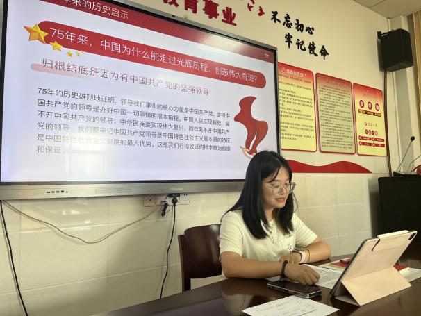 会上,钮洁菲同志借助视频和文字,结合一个又一个生动的案例,形象地带领与会人员重温了党领导人民走过的峥嵘岁月,从开天辟地的伟大创举到改革开放的历史壮举,再到新时代中国特色社会主义的伟大实践,每一步都凝聚着无数先辈的智慧与汗水。她强调,75年的历史雄辩地证明,领导我们事业的核心力量是中国共产党,坚持中国共产党的领导是办好中国一切事情的根本前提,中国人民实现解放,离不开中国共产党的领导,中华民族要实现伟大复兴,同样离不开中国共产党的领导,我们要牢记中国共产党领导是中国特色社会主义最本质的特征、是中国特色社会主义制度的最大优势。