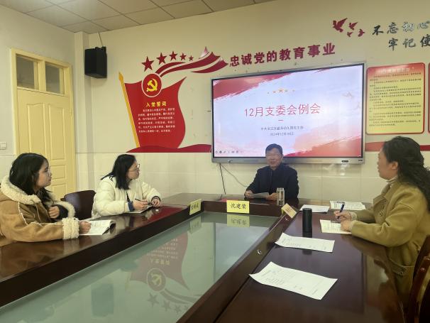 2024年12月18日,盛泽幼儿园党支部在辰星楼二楼会议室召开12月份支委会例会。本次会议共有两项议程:一是学习习近平总书记的新思想和党的二十届三中全会精神;二是商讨本月主题党日活动的开展。