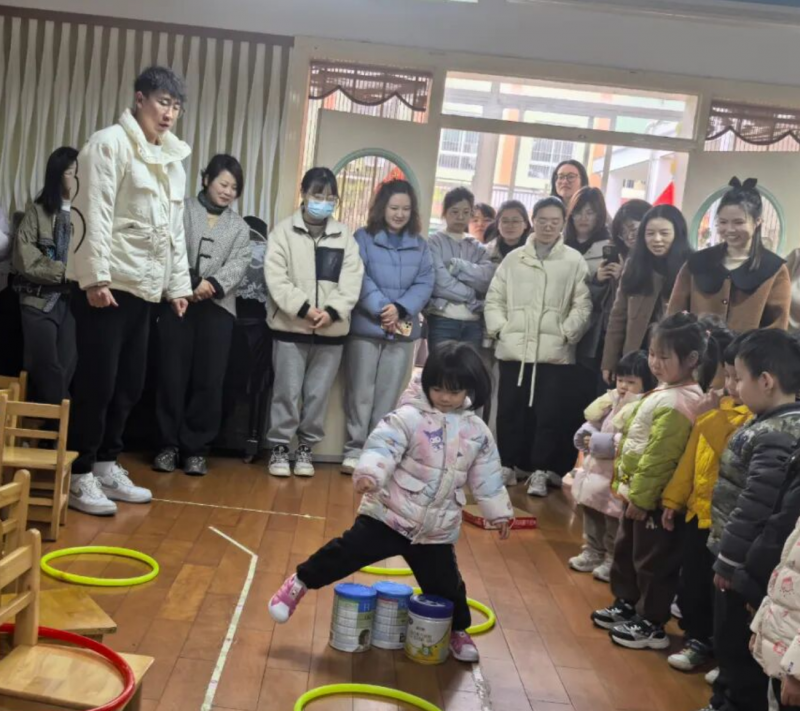 考虑到阴雨天无法开展户外活动的情况,本次培训特意安排了室内锻炼环节。李教练深入活动室,与教师一同探讨如何利用有限室内空间,通过椅子、桌子、奶粉罐等器材的巧妙运用,开展体育活动。教练全程沉浸式指导,从场地布置、游戏规则讲解到教师实际组织游戏,每一步都给予细致反馈,确保教师能在室内同样为幼儿营造充满活力的运动氛围。