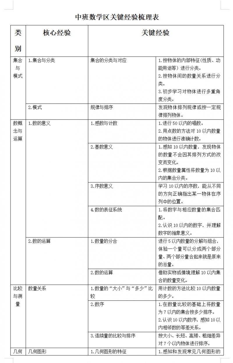 接着,盛幼教师逐条对照《指南》目标,将幼儿关键经验分为四大类目,八大核心经验,并按照年龄段细化关键经验,为将这些目标转化为数学区的实践密码,为后续实践奠定坚实的理论基础。