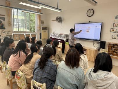 活动中,各班教师首先分享了本班围绕秋季自然资源(如树叶、果实、树枝、南瓜、玉米、花生等)所设计的课程环境方案。大家深刻认识到,优质的环境应源于幼儿的真实兴趣与疑问,是幼儿探索足迹的生动记录。大班组以“橘子”“南瓜”“玉米”“花生”等秋季农作物为载体,将主题元素全方位渗透于科学、美工、语言、数学、生活等各个区域,形成了沉浸式、互动性强的学习场域;中班组聚焦“秋叶”“树枝”“果实”等自然物,通过低结构材料的投放与幼儿全程参与,让环境成为可触摸、可探究、可表达的“成长手账”;小班组则充分考虑幼儿的年龄特点,以“树叶”“花朵”“南瓜”等为切入点,注重材料的感官性、安全性与操作性,营造出温馨童趣、支持小班幼儿亲近自然、动手体验的探索空间。