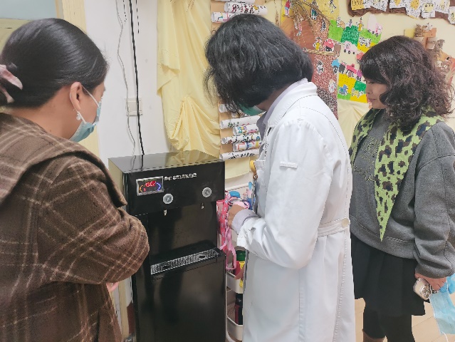 孙科长首先查看了保健室,对设施设备、 卫生消毒、药品管理、营养膳食等进行细致地检查,并进行专业指导。
