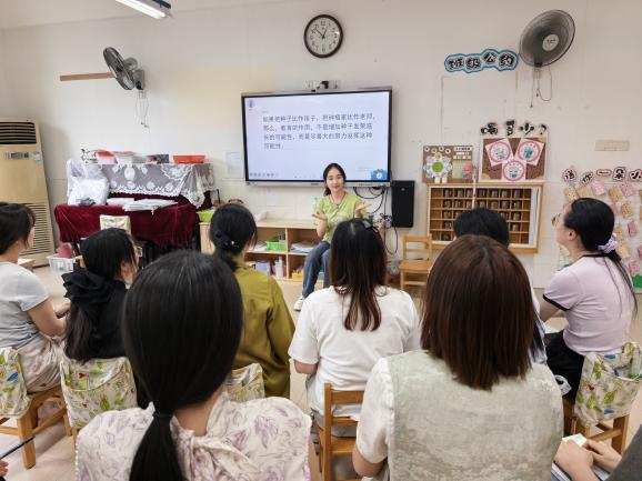 研讨环节,教师们立足本班教学实践各抒己见,围绕安全督护,交流了场地定期自查与幼儿自我保护教育相结合的有效做法,通过教幼儿“游戏前看一圈、摸一摸”等简单实用的方法,提升幼儿安全意识与自我保护能力;在场地规划方面,分享了利用园区自然地形分区创设游戏场景的经验,让不同年龄段幼儿都能找到适宜的探索空间,实现自主游戏的分层开展;针对材料投放,大家探讨了如何通过增添科探器材、多功能攀爬架、自然材料等,激发幼儿探究欲与协作能力,同时关注材料对不同能力幼儿的适配性,通过动态调整保持游戏新鲜感;在教师指导层面,核心围绕“适宜性”展开热议,明确了教师应避免包办或放任,通过适度示范、针对性提问等方式,引导幼儿自主解决游戏中遇到的问题,既保护幼儿的自主性,又助力其能力提升。此次活动让教师们系统掌握了户外自主游戏的科学组织策略,为优化户外教育实践筑牢了理论与实践根基。